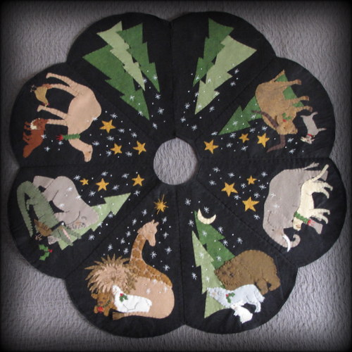 I have segmented the appliquéd pieces into easily managed "pie shaped" pieces that get sewn to the backing once complete