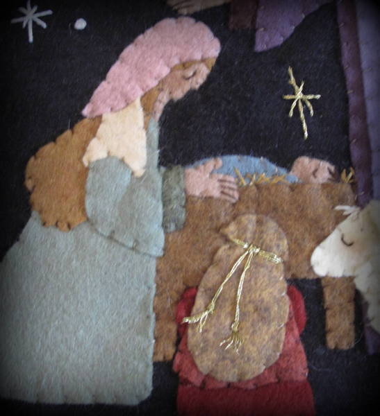 I have segmented the appliquéd pieces into easily managed "pie shaped" pieces that get sewn to the backing once complete