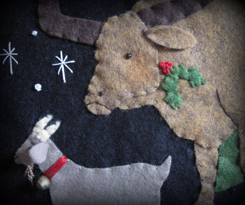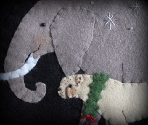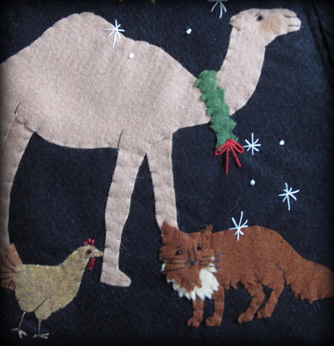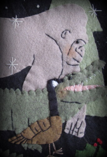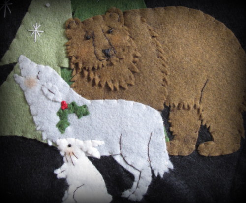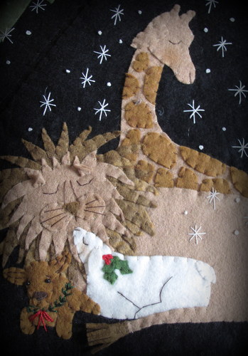 I have segmented the appliquéd pieces into easily managed "pie shaped" pieces that get sewn to the backing once complete